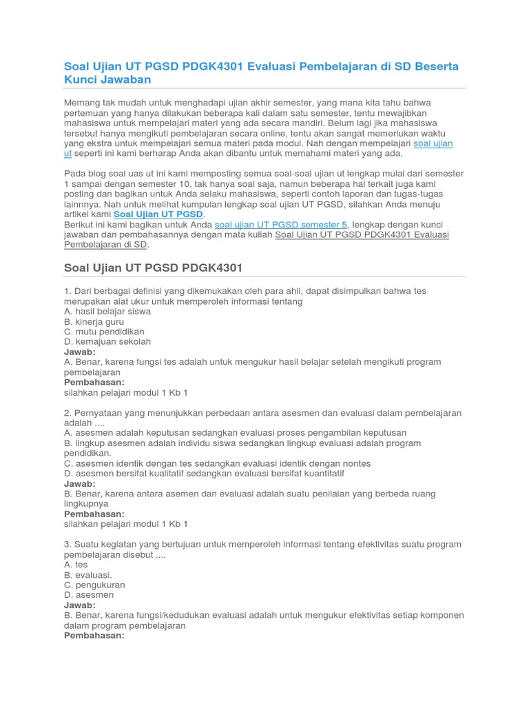 Soal Ujian Ut Pgsd Pdgk4301 Evaluasi Pembelajaran Di Sd Beserta Kunci Jawaban Pdf